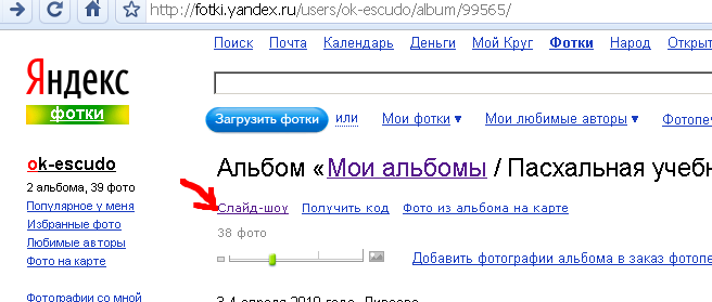 дальше создаем альбом, закачиваем фотографии - всё, как обычно. В режиме просмотра альбома выбираем ссылку "Слайдшоу"