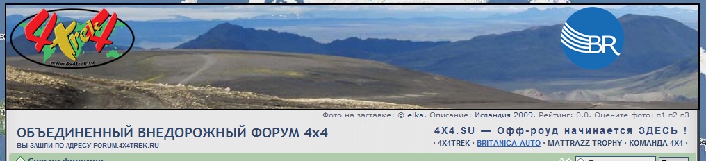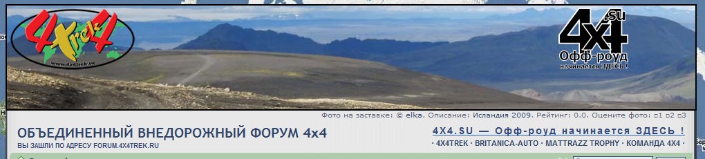 Я постарался сделать все компактно, и чтобы ссылки на все наши проекты были. Главная ссылка - на 4x4.su которую я предлагаю использовать как точку входа на все проекты, т.к. ее доменное имя очень хорошо должно раскрутиться на поисковиках (теперь это наше доменное имя). Далее сслыки на всех остальных. При наведении мышкой на ссылку вверху справа проявляется и исчезает соответствующий логотип. Слева постоянно висит логотип того проекта, по адресу которого зашли на форум. Фотки на заставке будут меняться ежедневно из базы.