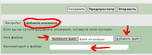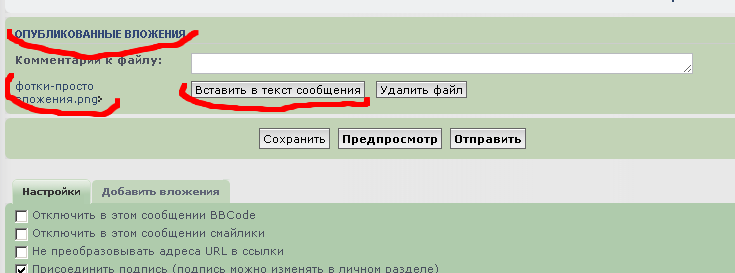 Эту процедуру нужно проделать для всех прикреплаемых фотографий. После каждого прикрепления между окном ввода текста и кнопками "Сохранить", "Предпросмотр" и "Отправить" в появившемся блоке "Опубликованные вложения" будут добавляться ссылки на закачанные фото.