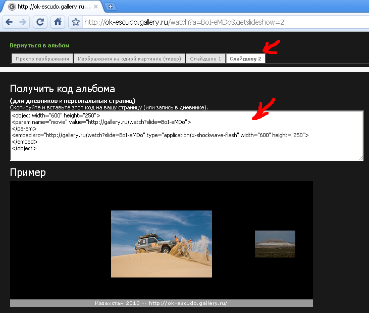 В появившемся окне выбираем закладку "Слайдшоу 2" и копируем в буфер обмена код альбома.