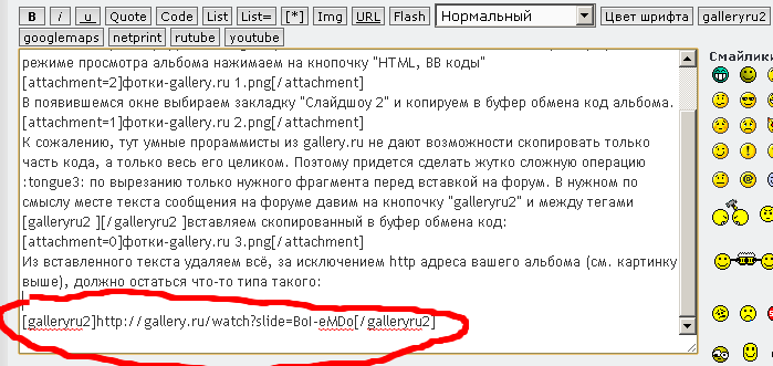 К сожалению, тут нет возможности скопировать только часть кода, а только весь его целиком. Поэтому придется сделать жутко сложную операцию :tongue3: по вырезанию только нужного фрагмента перед вставкой на форум. В нужном по смыслу месте текста сообщения на форуме давим на кнопочку "galleryru2" и между тегами [galleryru2 ][/galleryru2 ]вставляем скопированный в буфер обмена код: