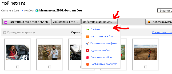 Как обычно, регистрируемся на netprint.ru, создаем там альбом и закачиваем фотографии. В режиме просмотра альбома выбираем кнопочку "Действия с альбомом", а в выпадающем списке - "Слайдшоу".