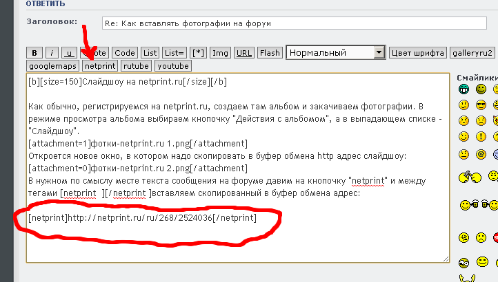 В нужном по смыслу месте текста сообщения на форуме давим на кнопочку "netprint" и между тегами [netprint ][/netprint ]вставляем скопированный в буфер обмена адрес: