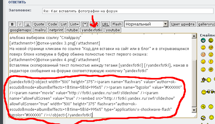 Вставляем скопированный текст полностью между тегами [yandexfotki] [/yandexfotki], нажав в редакторе сообщения на форуме соответствующую кнопочку "yandexfotki"