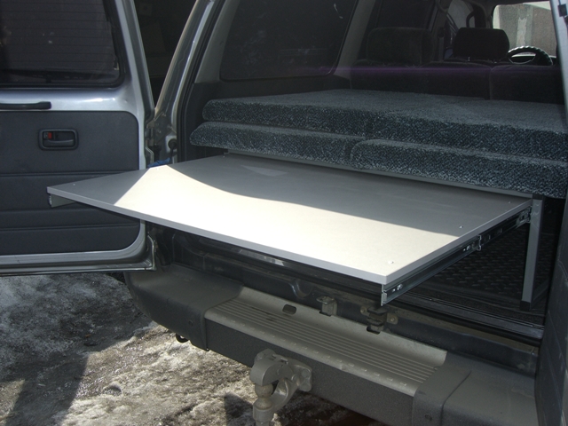 У меня это второй вариант полки. Первый был именно такой. Минусы - стойки на которых он стоит на полу съедают много места, сами матрасы тоже не маленькие - у меня был надувной толстый, получалось все под потолком, хотя патриот высокая машина. Поэтому стойки убрал в пазухи крыльев, а фанеру сделал армированную уголком чтобы она была тонкая и жесткая. т е когда 4 болта выкручиваешь все снимается легко и проем багажника полностью свободен. В продолжении просто кусок тонкой фанеры который кладется на сложенные задние спинки. А чтоб не прогибалось в голове веревочки вешаются на передние спинки. По полкой сделан стол на рельсах от сервера стоечного. Под полкой все масла и запчасти в ящиках надежно отделены от салона. Сверху тока мягкие шмотки. Матраса нет. Подстилка тонкая (живет по жизни там) чтоб не громыхало все и два спальника решают проблему.