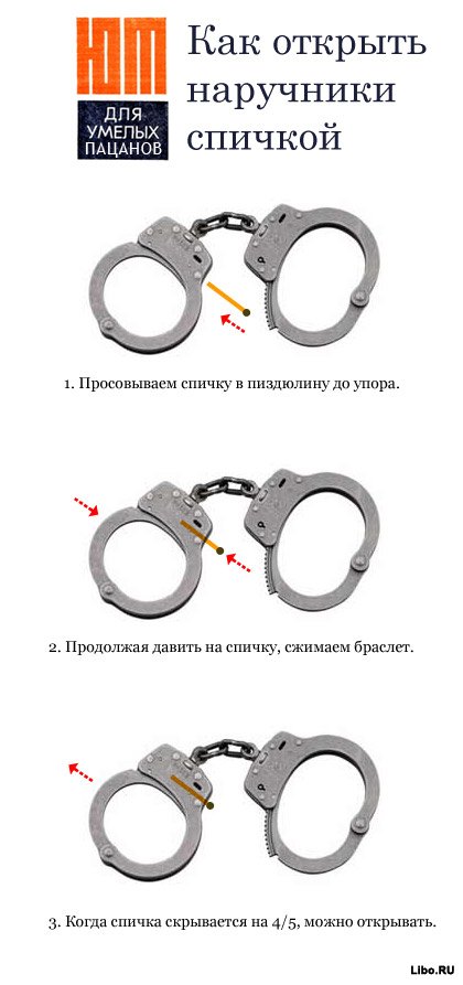 Ну я на себе не пробовала, конечно, и не знаю, на ком опробовали....Но народ в комментах писал, что можно еще использовать женские шпильки или пластиковую вилку. А вообще это конечно не для случаев с ментами....там понятно - побег еще хуже. Но еще бывает к батареям кого пристегивают, если задолжал чего..............вообщем....кто не спрятался, я не виноват :lol: